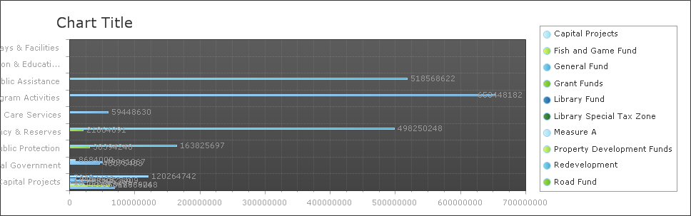 <telerik:RadChart ID="RadChart1" runat="server" DataGroupColumn="FUND_GROUP_NAME" DataSourceID="ProgramsDataSource" Height="303px" Width="968px" SeriesOrientation="Horizontal"> <Series><telerik:ChartSeries Name="Capital Projects " DataYColumn="TOT_END_BUDGET"></telerik:ChartSeries><telerik:ChartSeries Name="Fish and Game Fund " DataYColumn="TOT_END_BUDGET"></telerik:ChartSeries> <telerik:ChartSeries DataYColumn="TOT_END_BUDGET" Name="General Fund "> </telerik:ChartSeries> <telerik:ChartSeries DataYColumn="TOT_END_BUDGET" Name="Grant Funds "> </telerik:ChartSeries> <telerik:ChartSeries DataYColumn="TOT_END_BUDGET" Name="Library Fund "> </telerik:ChartSeries> <telerik:ChartSeries DataYColumn="TOT_END_BUDGET" Name="Library Special Tax Zone "> </telerik:ChartSeries> <telerik:ChartSeries DataYColumn="TOT_END_BUDGET" Name="Measure A "> </telerik:ChartSeries> <telerik:ChartSeries DataYColumn="TOT_END_BUDGET" Name="Property Development Funds "> </telerik:ChartSeries> <telerik:ChartSeries DataYColumn="TOT_END_BUDGET" Name="Redevelopment "> </telerik:ChartSeries> <telerik:ChartSeries DataYColumn="TOT_END_BUDGET" Name="Road Fund "> </telerik:ChartSeries></Series><PlotArea><XAxis DataLabelsColumn="PROG_NAME"> <AxisLabel> <Appearance RotationAngle="270"> </Appearance> </AxisLabel> <Items><telerik:ChartAxisItem Value="1"><TextBlock Text="Capital Projects"></TextBlock></telerik:ChartAxisItem><telerik:ChartAxisItem Value="2"><TextBlock Text="General Government"></TextBlock></telerik:ChartAxisItem><telerik:ChartAxisItem Value="3"><TextBlock Text="Public Protection"></TextBlock></telerik:ChartAxisItem><telerik:ChartAxisItem Value="4"><TextBlock Text="Contingency & Reserves"></TextBlock></telerik:ChartAxisItem><telerik:ChartAxisItem Value="5"><TextBlock Text="Health Care Services"></TextBlock></telerik:ChartAxisItem><telerik:ChartAxisItem Value="6"><TextBlock Text="Non Program Activities"></TextBlock></telerik:ChartAxisItem><telerik:ChartAxisItem Value="7"><TextBlock Text="Public Assistance"></TextBlock></telerik:ChartAxisItem><telerik:ChartAxisItem Value="8"><TextBlock Text="Cultural, Recreation & Education"></TextBlock><ActiveRegion Tooltip="Cultural, Recreation & Education"></ActiveRegion></telerik:ChartAxisItem></Items> </XAxis> <YAxis> <AxisLabel> <Appearance RotationAngle="0"> </Appearance> </AxisLabel> </YAxis> <YAxis2> <AxisLabel> <Appearance RotationAngle="0"> </Appearance> </AxisLabel> </YAxis2> </PlotArea> </telerik:RadChart> <asp:SqlDataSource ID="ProgramsDataSource" runat="server" ConnectionString="<%$ ConnectionStrings:db2dConnectionString %>" ProviderName="<%$ ConnectionStrings:db2dConnectionString.ProviderName %>" SelectCommand="SELECT F.FUND_GROUP_NAME, P.PROG_NAME, SUM(DB.END_BUDGET) AS TOT_END_BUDGET FROM BUAOWN.BU_ACCOUNT A, BUAOWN.BU_DEV_BUDGET DB, BUAOWN.BU_FUND F, BUAOWN.BU_DEV_FUND_ORG DFO, BUAOWN.BU_DEV_FUND_PROG DFP, BUAOWN.CAO_MAJOR_GROUP MG, BUAOWN.CAO_PROGRAM P, BUAOWN.CAO_DEPARTMENT D, BUAOWN.BU_ACCOUNT_CODE AC WHERE ( DB.ACCOUNTING_YEAR = DFO.ACCOUNTING_YEAR ) and ( DB.SCENARIO_CODE = DFO.SCENARIO_CODE ) and ( DB.ORG_CODE = DFO.ORG_CODE ) and ( DB.FUND_CODE = DFO.FUND_CODE ) and ( DB.ACCOUNTING_YEAR = DFP.ACCOUNTING_YEAR ) and ( DB.SCENARIO_CODE = DFP.SCENARIO_CODE ) and ( DB.ORG_CODE = DFP.ORG_CODE ) and ( DB.FUND_CODE = DFP.FUND_CODE ) and ( DB.PROGRAM_CODE = DFP.PROGRAM_CODE ) and ( DFO.PROG_CODE = P.PROG_CODE ) and ( DFP.DEPT_CODE = D.DEPT_CODE ) and ( F.FUND_CODE = DB.FUND_CODE ) and ( DB.ACCOUNTING_YEAR = A.ACCOUNTING_YEAR ) and ( A.ACCOUNTING_YEAR = MG.ACCOUNTING_YEAR ) and ( A.MAJOR_GRP_CODE = MG.MAJOR_GRP_CODE ) and ( DB.ACCOUNT_CODE = A.ACCOUNT_CODE ) and ( DB.ACCOUNT_CODE = AC.ACCOUNT_CODE ) and ( DB.END_BUDGET <> 0 )GROUP BY F.FUND_GROUP_NAME, P.PROG_NAME"></asp:SqlDataSource>| Capital Projects | Capital Projects | 120264742.00 |