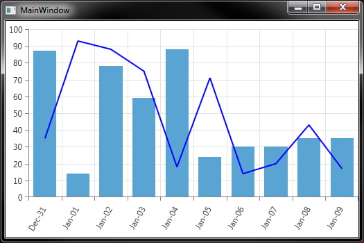 <Window x:Class="TwoDynamic.MainWindow" xmlns:telerik="http://schemas.telerik.com/2008/xaml/presentation" Title="MainWindow" Height="350" Width="525"> <Window.Resources> <ResourceDictionary> <DataTemplate x:Key="PointDataTemplate"> <Ellipse Width="4" Height="4" Fill="Red"/> </DataTemplate> </ResourceDictionary> </Window.Resources> <Grid> <telerik:RadCartesianChart> <telerik:RadCartesianChart.Resources> <Style TargetType="telerik:LineSeries"> <Setter Property="StrokeThickness" Value="2"/> <Setter Property="Stroke" Value="Blue" /> </Style> <Style TargetType="telerik:BarSeries"> <Setter Property="PointTemplate" Value="{StaticResource PointDataTemplate}" /> <Setter Property="CombineMode" Value="None"/> </Style> </telerik:RadCartesianChart.Resources> <telerik:RadCartesianChart.Grid> <telerik:CartesianChartGrid MajorLinesVisibility="XY" /> </telerik:RadCartesianChart.Grid> <telerik:RadCartesianChart.HorizontalAxis> <telerik:DateTimeContinuousAxis LabelFitMode="Rotate" LabelFormat="MMM-dd" /> </telerik:RadCartesianChart.HorizontalAxis> <telerik:RadCartesianChart.VerticalAxis> <telerik:LinearAxis/> </telerik:RadCartesianChart.VerticalAxis> <telerik:RadCartesianChart.SeriesProvider> <telerik:ChartSeriesProvider Source="{Binding Path=Series}"> <telerik:ChartSeriesProvider.SeriesDescriptors> <telerik:CategoricalSeriesDescriptor ItemsSourcePath="Data" TypePath="SeriesType" CategoryPath="Date" ValuePath="Value"/> </telerik:ChartSeriesProvider.SeriesDescriptors> </telerik:ChartSeriesProvider> </telerik:RadCartesianChart.SeriesProvider> </telerik:RadCartesianChart> </Grid></Window>MainWindow.xaml.cs: