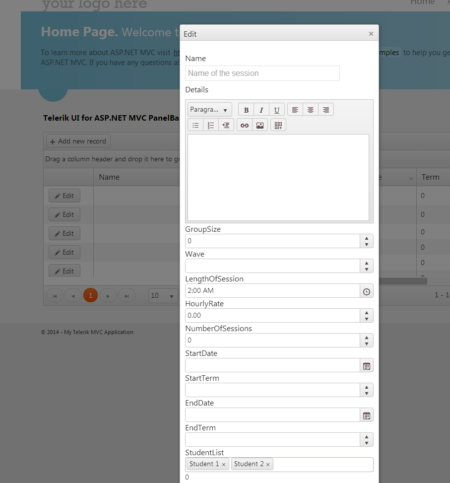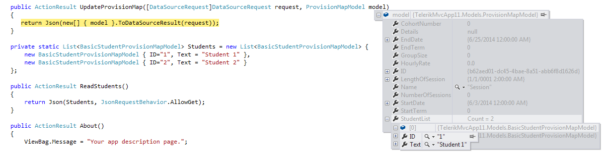 01.Html.Kendo().Grid<ProvisionMapModel>()02. 03. .Name("ProvisionMapGrid")04. .ToolBar(toolbar => toolbar.Create())05. .Columns(06. columns =>07. {08. columns.Bound(c => c.ID).Visible(false);09. columns.Command(c => c.Edit()).Width(100).Lockable(false).Locked(true);10. columns.Bound(c => c.Name).Width(200).Locked(true);11. columns.Bound(c => c.CohortNumber).Width(50);12. columns.Bound(c => c.Details).Width(50);13. columns.Bound(c => c.GroupSize).Width(50);14. columns.Bound(c => c.Wave).Width(50);15. columns.Bound(c => c.LengthOfSession).Format("{0:HH:mm}").Width(50);16. columns.Bound(c => c.HourlyRate).Visible(false);17. 18. columns.Bound(c => c.NumberOfSessions).Width(50);19. 20. 21. 22. columns.Bound(c => c.StartDate).Format("{0:dd MMM yy}").Width(150);23. columns.Bound(c => c.StartTerm).Title("Term").Width(100);24. columns.Bound(c => c.EndDate).Format("{0:dd MMM yy}").Width(150);25. columns.Bound(c => c.EndTerm).Title("Term").Width(100);26. columns.Bound(c => c.StudentList).ClientTemplate("<span class=\"badge\">#=StudentList.length#").Width(50);27. 28. @*columns.Template(@<text></text>).ClientTemplate("<a class='btn btn-sm btn-primary' href='" + @Url.Action("Details", "Reports", new { area="ProvisionMap", id="#=ID#" }) + "'><span class=\"glyphicon glyphicon-user\"></span> Details</a>");*@29. 30. }31. )32. .Editable(edit =>33. edit.TemplateName("ProvisionMapEditor").Mode(GridEditMode.PopUp)34. .Window(window =>35. {36. window.HtmlAttributes(new { @class = "kendo-popup-editor" });37. })38. 39. )40. .DataSource(ds =>41. ds.Ajax().ServerOperation(true)42. .Read(read => read.Action("ReadProvisionMap", "Home", new { area = "ProvisionMap" }))43. .Create(create => create.Action("CreateProvisionMap", "Home", new { area = "ProvisionMap" }).Data("sendAntiForgery"))44. .Update(update => update.Action("UpdateProvisionMap", "Home", new { area = "ProvisionMap" }).Data("sendAntiForgery"))45..Events(events => events.Error("NewError_Handler"))46. .Model(model =>47. {48. model.Id(m => m.ID);49. model.Field(m => m.ID).DefaultValue(Guid.NewGuid());50. 51. model.Field(m => m.Details);52. model.Field(m => m.GroupSize);53. model.Field(m => m.Wave);54. model.Field(m => m.LengthOfSession);55. model.Field(m => m.HourlyRate);56. 57. model.Field(m => m.NumberOfSessions);58. model.Field(m => m.Name);59. 60. model.Field(m => m.StartDate);61. model.Field(m => m.StartTerm);62. 63. model.Field(m => m.EndDate);64. model.Field(m => m.EndTerm);65. model.Field(m => m.StudentList).DefaultValue(new List<BasicStudentProvisionMapModel>());66. 67. 68. })69. 70. 71. ).Sortable()72. .Pageable(page => page.PageSizes(new int[] { 10, 20, 50, 100, 250, 1000 }).Refresh(true))73. .Groupable()74. .Resizable(resize => resize.Columns(true))75. .Filterable()76. .HtmlAttributes(new { style = "min-height:300px;" })77. .Scrollable()78. 79. .ColumnMenu()80. .Events(events =>81. {82. events.Edit("PopUpEditorRefresh");83. })The grid model and the BasicStudentProvisionMapModel are these classes: