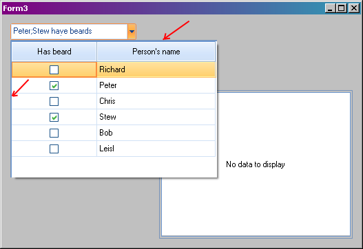 using System.Collections.Generic; using System.Windows.Forms; using Telerik.WinControls; using Telerik.WinControls.UI; using Telerik.WinControls.RadControlSpy; namespace RadControlsWinFormsApp1 { public partial class Form1 : Form { private List<Person> people = new List<Person>(); private RadPanel m_Panel; private RadGridView m_Grid; private RadTextBoxElement m_TextBox; private System.Drawing.Size m_Size = new System.Drawing.Size(300, 200); public Form1() { InitializeComponent(); RadControlSpyForm form = new RadControlSpyForm(); form.Show(); m_TextBox = new RadTextBoxElement(); m_TextBox.TextBoxItem.ReadOnly = true; people.Add(new Person("Richard", false)); people.Add(new Person("Peter", true)); people.Add(new Person("Chris", false)); people.Add(new Person("Stew", true)); people.Add(new Person("Bob", false)); people.Add(new Person("Leisl", false)); m_Grid = new RadGridView(); m_Grid.AllowAddNewRow = false; m_Grid.EnableFiltering = true; m_Grid.ShowRowHeaderColumn = false; m_Grid.EnableGrouping = false; m_Grid.ShowFilteringRow = true; m_Grid.AutoSizeRows = true; m_Grid.DataBindingComplete += new GridViewBindingCompleteEventHandler(m_Grid_DataBindingComplete); m_Grid.DataSource = people; m_Panel = new RadPanel(); m_Panel.Controls.Add(m_Grid); m_Grid.Dock = DockStyle.Fill; RadMenuItem item = new RadMenuItem(); item.MaxSize = m_Size; this.radSplitButton1.Items.Add(item); this.radSplitButton1.DropDownButtonElement.DropDownMenu.PopupOpened += new RadPopupOpenedEventHandler(DropDownMenu_PopupOpened); this.radSplitButton1.DropDownButtonElement.DropDownMenu.PopupClosing += new RadPopupClosingEventHandler(DropDownMenu_PopupClosing); // force show to data bind this.radSplitButton1.DropDownButtonElement.ShowDropDown(); this.radSplitButton1.DropDownButtonElement.HideDropDown(); } private void Form1_Load(object sender, System.EventArgs e) { // add a textbox element to the SplitButton m_TextBox.AutoSize = false; m_TextBox.Size = new System.Drawing.Size(this.radSplitButton1.DropDownButtonElement.ActionButton.Size.Width, this.radSplitButton1.DropDownButtonElement.ActionButton.Size.Height + 1); this.radSplitButton1.DropDownButtonElement.ActionButton.Children.Add(m_TextBox); } void DropDownMenu_PopupClosing(object sender, RadPopupClosingEventArgs args) { m_Grid.EndEdit(); SetText(); } void m_Grid_DataBindingComplete(object sender, GridViewBindingCompleteEventArgs e) { m_Grid.AutoSizeColumnsMode = GridViewAutoSizeColumnsMode.Fill; m_Grid.Columns["Name"].ReadOnly = true; m_Grid.Columns["HasBeard"].ReadOnly = false; m_Grid.Columns["Name"].BestFit(); m_Grid.Columns["HasBeard"].BestFit(); SetText(); } void DropDownMenu_PopupOpened(object sender, System.EventArgs args) { this.radSplitButton1.DropDownButtonElement.DropDownMenu.PopupElement.MaxSize = m_Size; this.radSplitButton1.Items.Clear(); m_Panel.Size = m_Size; RadMenuItem item = new RadMenuItem(); item.AutoSize = false; item.BackColor = System.Drawing.Color.Transparent; item.Size = m_Panel.Size; item.Alignment = System.Drawing.ContentAlignment.MiddleCenter; item.Children.Add(new RadHostItem(m_Panel)); this.radSplitButton1.Items.Add(item); } private void SetText() { string people = ""; foreach (GridViewRowInfo row in m_Grid.ChildRows) { if (row is GridViewDataRowInfo) { if (((bool)row.Cells["HasBeard"].Value) == true) { people = people + row.Cells["Name"].Value.ToString() + ";"; } } } if (people.Length > 0) { people = people.Remove(people.Length-1, 1); this.m_TextBox.Text = people + " have beards"; } else { this.m_TextBox.Text = "nobody has a beard"; } } } public class Person { public Person(string name, bool hasBeard) { this.Name = name; this.HasBeard = hasBeard; } public string Name { get; set; } public bool HasBeard { get; set; } } } Hope that help, but let me know if you need more information