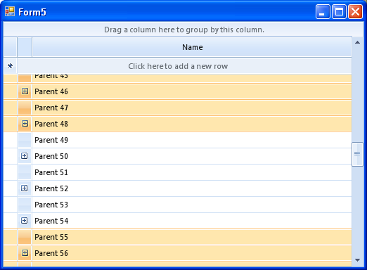 using System;using System.Collections.Generic;using System.ComponentModel;using System.Data;using System.Drawing;using System.Text;using System.Windows.Forms;using Telerik.WinControls.UI;namespace RadControllTest{ public partial class Form5 : Form { RadGridView myGrid; MyGridBehavior myGridBehavior; public Form5() { InitializeComponent(); SetupGrid(); } private void SetupGrid() { myGrid = new RadGridView(); myGrid.Dock = DockStyle.Fill; myGrid.AutoSizeColumnsMode = GridViewAutoSizeColumnsMode.Fill; myGrid.MultiSelect = true; GridViewTextBoxColumn nameColumn = new GridViewTextBoxColumn("Name"); myGrid.Columns.Add(nameColumn); myGrid.ViewCellFormatting += new CellFormattingEventHandler(gridView_ViewCellFormatting); myGrid.ChildViewExpanding += new ChildViewExpandingEventHandler(gridView_ChildViewExpanding); myGrid.CurrentRowChanging += new CurrentRowChangingEventHandler(myGrid_CurrentRowChanging); myGridBehavior = new MyGridBehavior(); myGrid.GridBehavior = myGridBehavior; GridViewTemplate childTemplate = new GridViewTemplate(); myGrid.Templates.Add(childTemplate); GridViewDecimalColumn idColumn = new GridViewDecimalColumn("ID"); childTemplate.Columns.Add(idColumn); GridViewTextBoxColumn childNameColumn = new GridViewTextBoxColumn("Name"); childTemplate.Columns.Add(childNameColumn); GridViewRelation relation = new GridViewRelation(myGrid.MasterTemplate, childTemplate); relation.ChildColumnNames.Add("Children"); myGrid.Relations.Add(relation); this.Controls.Add(myGrid); BindingList<MockParent> parents = new BindingList<MockParent>(); for (int i = 0; i < 100; i++) { MockParent p = new MockParent("Parent " + i.ToString()); if ((i % 2) == 0) { BindingList<MockChild> children = new BindingList<MockChild>(); for (int j = 1; j < 5; j++) { children.Add(new MockChild(j, "Child " + j.ToString())); } p.Children = children; } parents.Add(p); } myGrid.DataSource = parents; myGrid.AutoGenerateHierarchy = true; childTemplate.ShowColumnHeaders = false; childTemplate.ShowRowHeaderColumn = false; } void myGrid_CurrentRowChanging(object sender, CurrentRowChangingEventArgs e) { System.Diagnostics.Debug.WriteLine("CurrentRowChanging"); if (myGridBehavior.ExpanderClicked) { System.Diagnostics.Debug.WriteLine("CurrentRowChanging Canceled"); e.Cancel = true; } } void gridView_ChildViewExpanding(object sender, ChildViewExpandingEventArgs e) { if ((e.ParentRow != null) && (e.ParentRow.ChildRows.Count < 1)) { e.Cancel = true; } } void gridView_ViewCellFormatting(object sender, CellFormattingEventArgs e) { GridGroupExpanderCellElement cell = e.CellElement as GridGroupExpanderCellElement; if (cell != null && e.CellElement.RowElement is GridDataRowElement) { if ((cell.RowInfo.ChildRows != null) && (cell.RowInfo.ChildRows.Count > 0)) { cell.Expander.Visibility = Telerik.WinControls.ElementVisibility.Visible; } else { cell.Expander.Visibility = Telerik.WinControls.ElementVisibility.Hidden; } } } private class MyGridBehavior : BaseGridBehavior { public bool ExpanderClicked { get; set; } public override bool OnMouseDown(MouseEventArgs e) { System.Diagnostics.Debug.WriteLine("MouseDown"); ExpanderClicked = false; if (this.CellAtPoint is GridGroupExpanderCellElement) { GridViewRowInfo row = this.CellAtPoint.RowInfo; if ((row != null) && (row.ChildRows.Count > 0)) { ExpanderClicked = true; } } return base.OnMouseDown(e); } public override bool OnMouseUp(MouseEventArgs e) { System.Diagnostics.Debug.WriteLine("MouseUp"); ExpanderClicked = false; return base.OnMouseUp(e); } } private class MockParent { public string Name { get; set; } public BindingList<MockChild> Children { get; set; } public MockParent(string s) { Name = s; } } private class MockChild { public int ID { get; set; } public string Name { get; set; } public MockChild(int id, string s) { ID = id; Name = s; } } }}