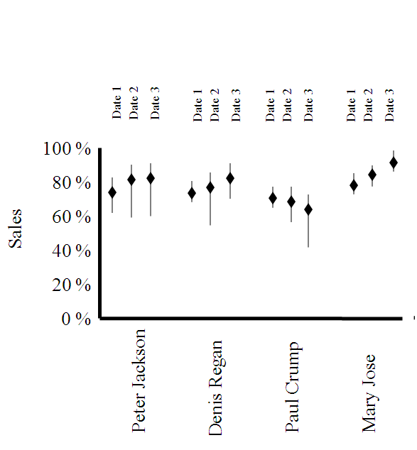 EmployeeName = "Peter Jackson" , Date = Date 1, MinValue= "60%", MaxValue = "80%" , Average = "70%"EmployeeName = "Peter Jackson" , Date = Date 2, MinValue= "65%", MaxValue = "90%" , Average = "80%"EmployeeName = "Peter Jackson" , Date = Date 3, MinValue= "70%", MaxValue = "100%" , Average = "90%"EmployeeName = "Denis Regan" , Date = Date 1, MinValue= "66%", MaxValue = "86%" , Average = "72%"EmployeeName = "Denis Regan" , Date = Date 2, MinValue= "68%", MaxValue = "92%" , Average = "85%"EmployeeName = "Denis Regan" , Date = Date 3, MinValue= "78%", MaxValue = "100%" , Average = "90%"We need to group by EmployeeName on X axis.