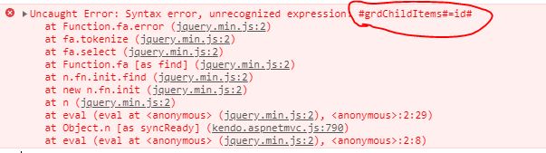The error shows that the engine is trying to evaluate the #grdChildItems#=id# expression which is not a correct one. If the #grdChildItems should be "an element with id grdChildItems" selector, then the first hash should be escaped as explained below: