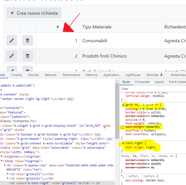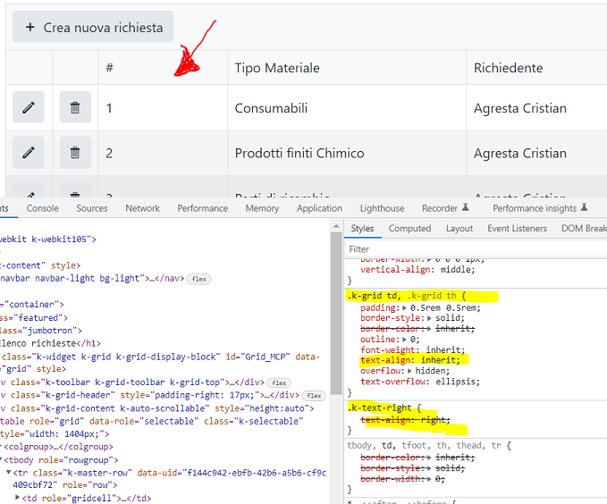 Checking the class I see the problem is the "text-align: inherit;" of k-grid class
