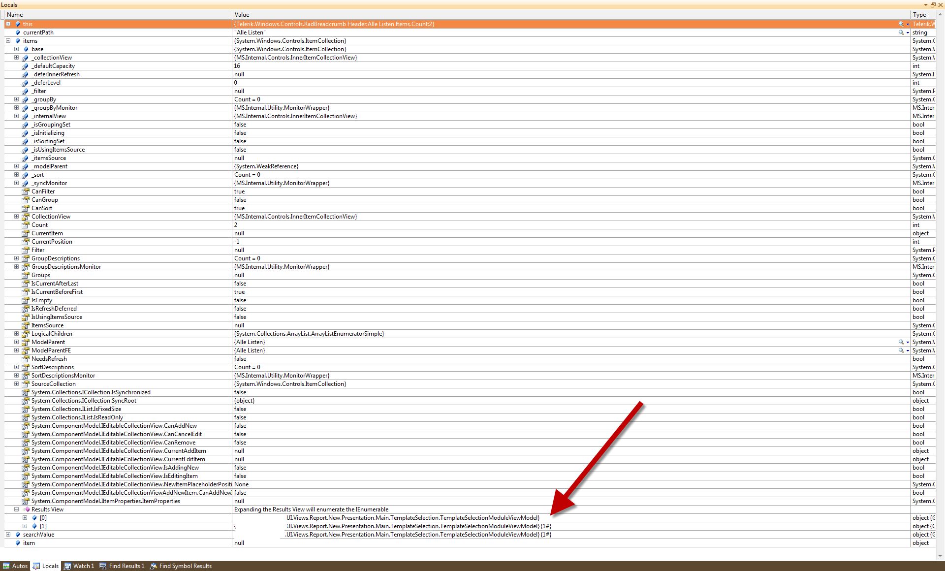 at Telerik.Windows.Controls.RadBreadcrumb.FindCurrentItemRecursively(String currentPath, IEnumerable items, Object searchValue) in c:\TB\117\WPF_Scrum\Current_HotFix\Sources\Development\Controls\Navigation\Breadcrumb\RadBreadcrumb.cs:line 919at Telerik.Windows.Controls.RadBreadcrumb.FindCurrentItemRecursively(String currentPath, IEnumerable items, Object searchValue) in c:\TB\117\WPF_Scrum\Current_HotFix\Sources\Development\Controls\Navigation\Breadcrumb\RadBreadcrumb.cs:line 931at Telerik.Windows.Controls.RadBreadcrumb.FindCurrentItem(Object newValue) in c:\TB\117\WPF_Scrum\Current_HotFix\Sources\Development\Controls\Navigation\Breadcrumb\RadBreadcrumb.cs:line 914at Telerik.Windows.Controls.RadBreadcrumb.OnCurrentItemChanged(Object oldValue, Object newValue) in c:\TB\117\WPF_Scrum\Current_HotFix\Sources\Development\Controls\Navigation\Breadcrumb\RadBreadcrumb.cs:line 583at Telerik.Windows.Controls.RadBreadcrumb.OnCurrentItemPropertyChanged(DependencyObject d, DependencyPropertyChangedEventArgs e) in c:\TB\117\WPF_Scrum\Current_HotFix\Sources\Development\Controls\Navigation\Breadcrumb\RadBreadcrumb.Properties.cs:line 476at System.Windows.DependencyObject.OnPropertyChanged(DependencyPropertyChangedEventArgs e)at System.Windows.FrameworkElement.OnPropertyChanged(DependencyPropertyChangedEventArgs e)at System.Windows.DependencyObject.NotifyPropertyChange(DependencyPropertyChangedEventArgs args)at System.Windows.DependencyObject.UpdateEffectiveValue(EntryIndex entryIndex, DependencyProperty dp, PropertyMetadata metadata, EffectiveValueEntry oldEntry, EffectiveValueEntry& newEntry, Boolean coerceWithDeferredReference, Boolean coerceWithCurrentValue, OperationType operationType)at System.Windows.DependencyObject.InvalidateProperty(DependencyProperty dp)at System.Windows.Data.BindingExpressionBase.Invalidate(Boolean isASubPropertyChange)at System.Windows.Data.BindingExpression.TransferValue(Object newValue, Boolean isASubPropertyChange)at System.Windows.Data.BindingExpression.Activate(Object item)at System.Windows.Data.BindingExpression.AttachToContext(AttachAttempt attempt)at System.Windows.Data.BindingExpression.MS.Internal.Data.IDataBindEngineClient.AttachToContext(Boolean lastChance)at MS.Internal.Data.DataBindEngine.Task.Run(Boolean lastChance)at MS.Internal.Data.DataBindEngine.Run(Object arg)at MS.Internal.Data.DataBindEngine.OnLayoutUpdated(Object sender, EventArgs e)at System.Windows.ContextLayoutManager.fireLayoutUpdateEvent()at System.Windows.ContextLayoutManager.UpdateLayout()at System.Windows.UIElement.UpdateLayout()at System.Windows.Interop.HwndSource.SetLayoutSize()at System.Windows.Interop.HwndSource.set_RootVisualInternal(Visual value)at System.Windows.Interop.HwndSource.set_RootVisual(Visual value)at System.Windows.Window.SourceWindowHelper.set_RootVisual(Visual value)at System.Windows.Window.SetRootVisual()at System.Windows.Window.SetRootVisualAndUpdateSTC()at System.Windows.Window.SetupInitialState(Double requestedTop, Double requestedLeft, Double requestedWidth, Double requestedHeight)at System.Windows.Window.CreateSourceWindow(Boolean duringShow)at System.Windows.Window.CreateSourceWindowDuringShow()at System.Windows.Window.SafeCreateWindowDuringShow()at System.Windows.Window.ShowHelper(Object booleanBox)at System.Windows.Window.Show()at System.Windows.Window.ShowDialog()One more thing, I just had the idea it might be the problem that I am binding collections of different types on different levels of the hierarchy, so it might be that your FindCurrentItemsRecursively method has problems with that? Here's the markup code, maybe that helps you to understand our binding scenario.