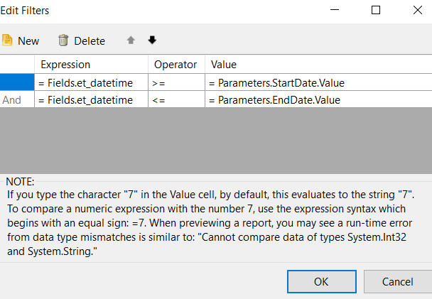 Hello, I very new with telerik reporting. Currently I,m create a report for my WPF application. My problem is the data in the report not display after I add search filter for startdate and end date. Here I attach the picture how I do the filter