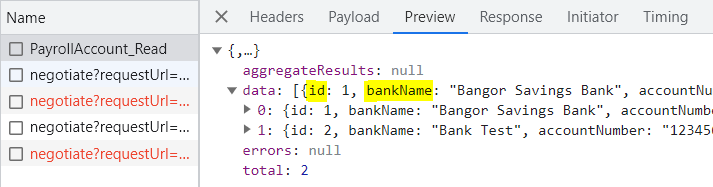 new PayrollAccountModel { Id = 1, BankName = "Bangor Savings Bank", AccountNumber = "99999999", RoutingNumber = "123456789" },