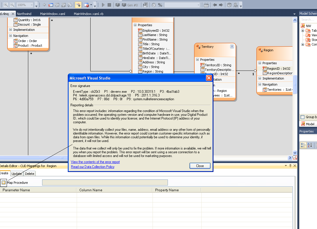Worse still, when I import a single table into the model and go to the CUD mappings the VS IDE crashes (see attached pic).