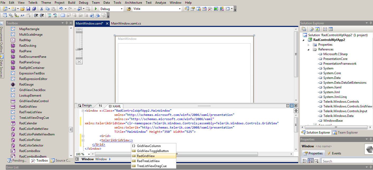 I downloaded new version of telerik wpf controls. I am adding dll of telerik.windows.controls.dll and telerik.windows.control.gridview with other dlls. I can add the refrernece of gridview namespace but when i am using it by tag <telerikGridView: .. GridView is not visible. Also in the toolbox other controls are coming not the gridview.