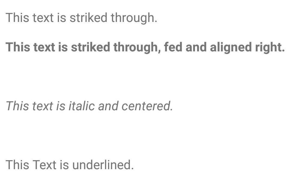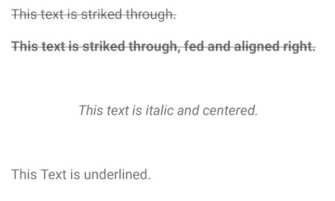 <s> This text is striked through.</s><strong> <s> <div style="text-align:right;"> This text is striked through, fed and aligned right. </div> </s></strong><em> <div style="text-align:center;"> This text is italic and centered. </div></em><ins> This Text is underlined.</ins>