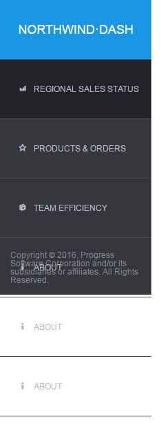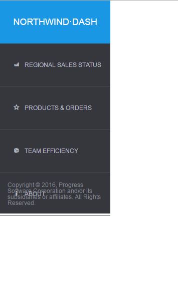 <div class="container-fluid"> <!--open container--> <div class="row row-offcanvas row-offcanvas-left"> <!--open row--> <div id="nav-section" class="col-xs-12 column"> <!--open nav column--> <div class="navbar-default"> <button id="toggle-button" type="button" class="navbar-toggle" data-toggle="collapse" data-target=".navbar-collapse"> <span class="icon-bar"></span> <span class="icon-bar"></span> <span class="icon-bar"></span> </button> </div> <h1 id="dash-logo" class="center-block">Northwind·Dash</h1> <div class="collapse navbar-collapse" id="sidebar-nav" role="navigation"> <ul class="nav"> <li id="regional-sales-status"> <a href="index.html"> <span class="icon icon-chart-column"></span>Regional Sales Status</a> </li> <li id="products-and-orders"> <a href="products-orders.html"> <span class="icon icon-star-empty"></span>Products & Orders</a> </li> <li id="team-efficiency"> <a href="team-efficiency.html"> <span class="icon icon-faves"></span>Team Efficiency</a> </li> <li id="about"> <a href="about.html"> <span class="icon icon-info"></span>About</a> </li> </ul> <div id="rights"> <p>Copyright © 2016, Progress Software Corporation and/or its subsidiaries or affiliates. All Rights Reserved.</p> </div> </div> <!--close main column--> </div> <!--close row--> </div> <!--close container-->The navbar will not be full height in my page.