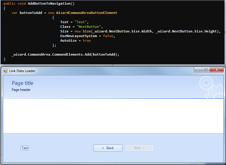 I would like to add another (custom) button (which has the look and feel of the buttons I just mentioned above / different text) which launches off a process and eventually returns.... I was wondering if there is an easy way to do this? I've been messing around for a few hours now and I'm able to add a "Test" button; however, it is not in the correct order (I would like it to appear between the Next/Back buttons and it's size is being changed during runtime (I'm assuming this is something to do with the CommandArea object's LayoutManager?)) - see the attached screenshot
