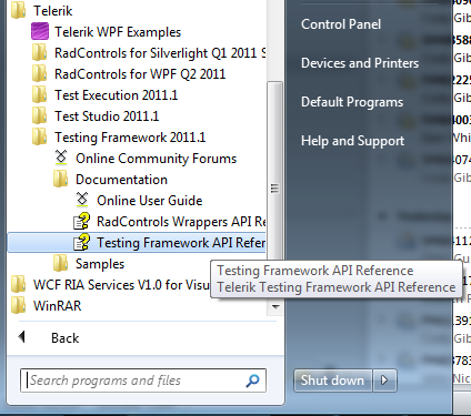 Also when installing/updating Test Studio you are getting the latest API Reference at the moment(the one on site might be an older version). The easiest way to find it is from the Start menu, Telerik->Testing Framework 2011.1->Documentation->Testing Framework API Reference(see screenshot).