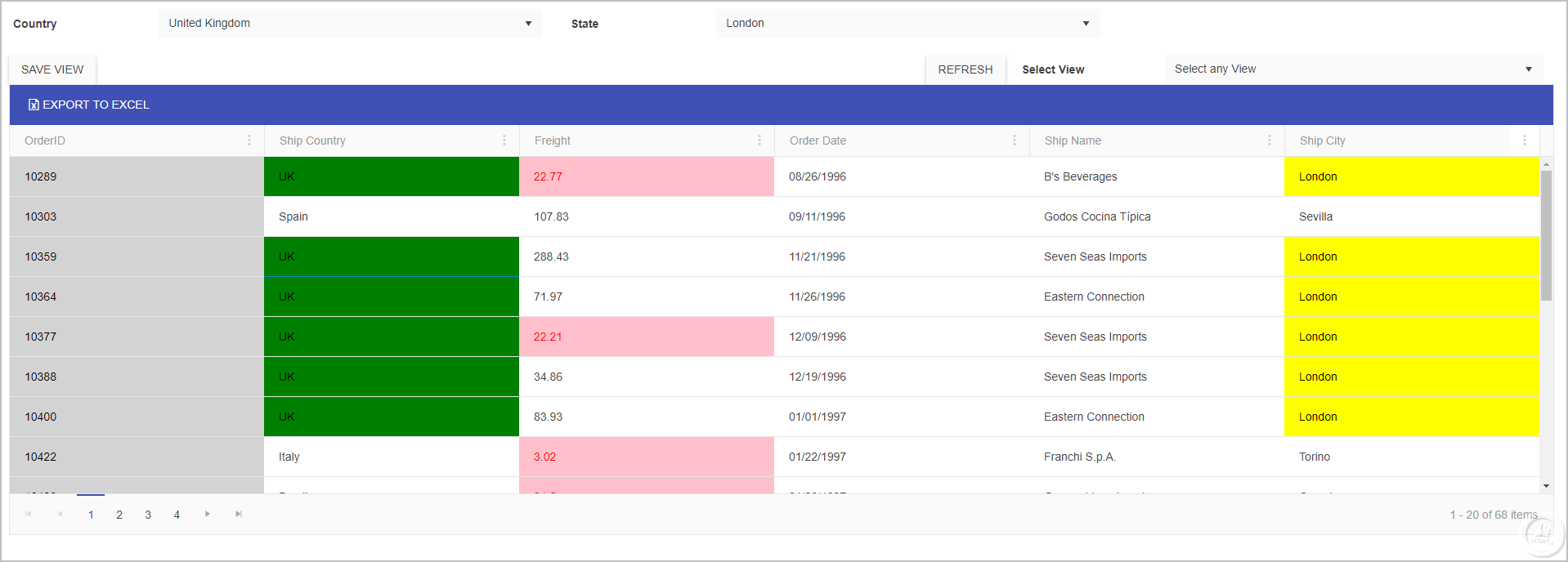 2) Colour Green and yellow background for the selected country and state in Ship Country and Ship city respectively