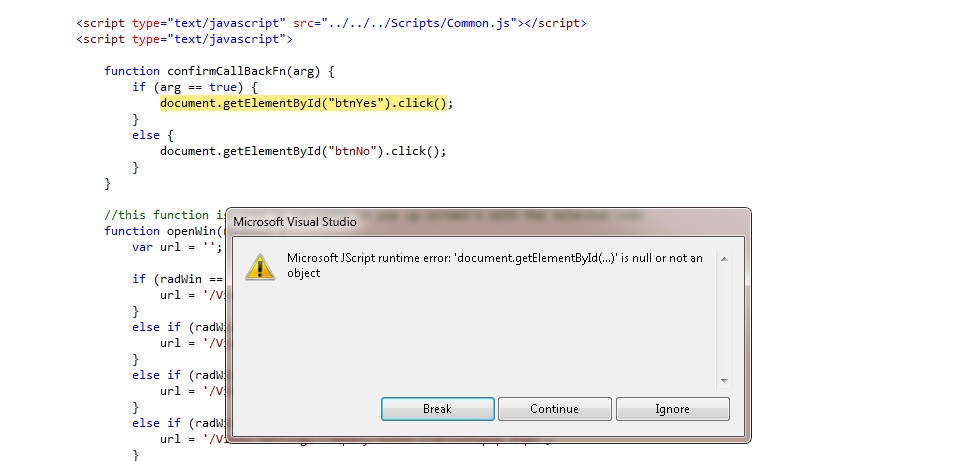 function confirmCallBackFn(arg) { if (arg == true) { document.getElementById("Button1").click(); } else { document.getElementById("Button2").click(); }}C#: