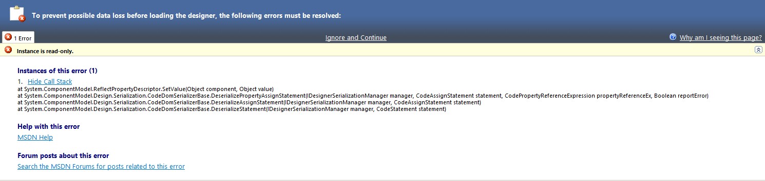 at System.ComponentModel.Design.Serialization.CodeDomSerializerBase.DeserializePropertyAssignStatement(IDesignerSerializationManager manager, CodeAssignStatement statement, CodePropertyReferenceExpression propertyReferenceEx, Boolean reportError)