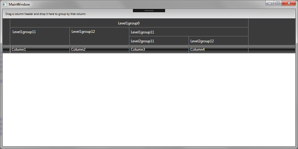 <telerik:RadGridView> <telerik:RadGridView.ColumnGroups > <telerik:GridViewColumnGroup Name="Level1group0" > <telerik:GridViewColumnGroup.ChildGroups> <telerik:GridViewColumnGroup Name="Level1group11"> <telerik:GridViewColumnGroup.ChildGroups> <telerik:GridViewColumnGroup Name="Level2group11"/> <telerik:GridViewColumnGroup Name="Level2group12"/> </telerik:GridViewColumnGroup.ChildGroups> </telerik:GridViewColumnGroup> <telerik:GridViewColumnGroup Name="Level1group12"/> </telerik:GridViewColumnGroup.ChildGroups> </telerik:GridViewColumnGroup> </telerik:RadGridView.ColumnGroups> <telerik:RadGridView.Columns> <telerik:GridViewDataColumn ColumnGroupName="Level1group11" Width="200" Header="Column1"/> <telerik:GridViewDataColumn ColumnGroupName="Level1group12" Width="200" Header="Column2"/> <telerik:GridViewDataColumn ColumnGroupName="Level2group11" Width="200" Header="Column3"/> <telerik:GridViewDataColumn ColumnGroupName="Level2group12" Width="200" Header="Column4"/> </telerik:RadGridView.Columns></telerik:RadGridView>