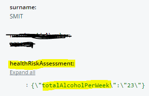 var data = [ { "Id": "asdads", "surname": "asdaassadds", "healthRiskAssessment": { "totalAlcoholPerWeek": "test 59" } }];