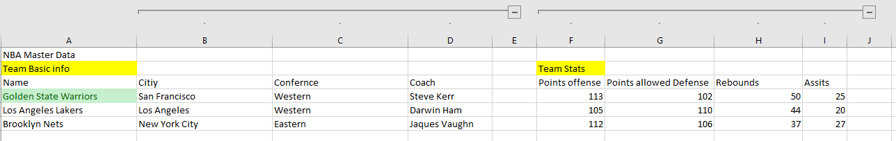 Considering the yellow cells. Team Basic Info and Team Stats are two Buttons. Team Basic Info is the default View. How can I implement the Team Stats Button so it shows the team stats table and hides the Team Basic Info and vice-versa?