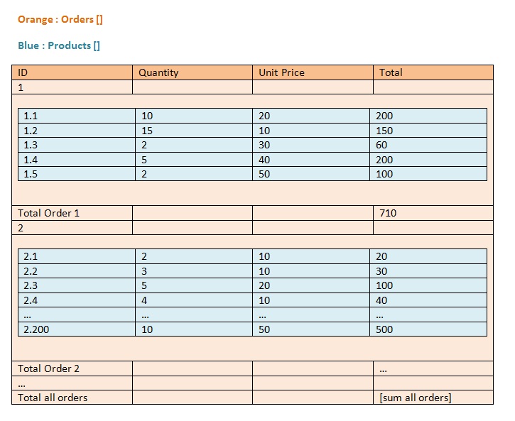 Assume we have an array with Orders, and in this table is an array with Products. So for each Order we have several Products.