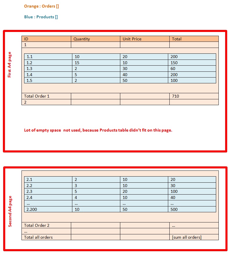 Now the problem is that some Orders have a lot of Products: for example 200 Products. An order doesn't necessarily begin at the beginning of the A4 page (it can be in the middle). So the array of Products of the second Order doesn’t fit on the first page, and it makes automatically a page break (because its 1 merged line of the main table?).