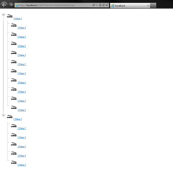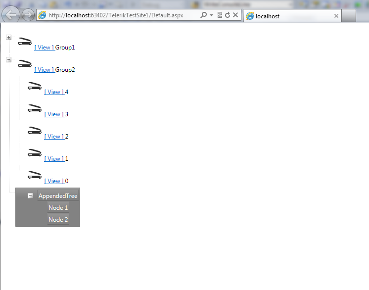 RadTreeNode category1 = new RadTreeNode("Group1", "Group1"); RadTreeNode Category1Nodes; RadTreeNodeCollection radCollection = new RadTreeNodeCollection(category1); for (int i = 10 - 1; i >= 0; i--) { Category1Nodes = new RadTreeNode(i.ToString(), i.ToString()); category1.Nodes.Add(Category1Nodes); } RadTreeView1.Nodes.Add(category1); RadTreeNode category2 = new RadTreeNode("Group2", "Group2"); RadTreeNode Category2Nodes; radCollection = new RadTreeNodeCollection(category2); for (int i = 5 - 1; i >= 0; i--) { Category2Nodes = new RadTreeNode(i.ToString(), i.ToString()); category2.Nodes.Add(Category2Nodes); } RadTreeView1.Nodes.Add(category2);now, I want to add Category3, but I am wondering if I can attach a treeView to that