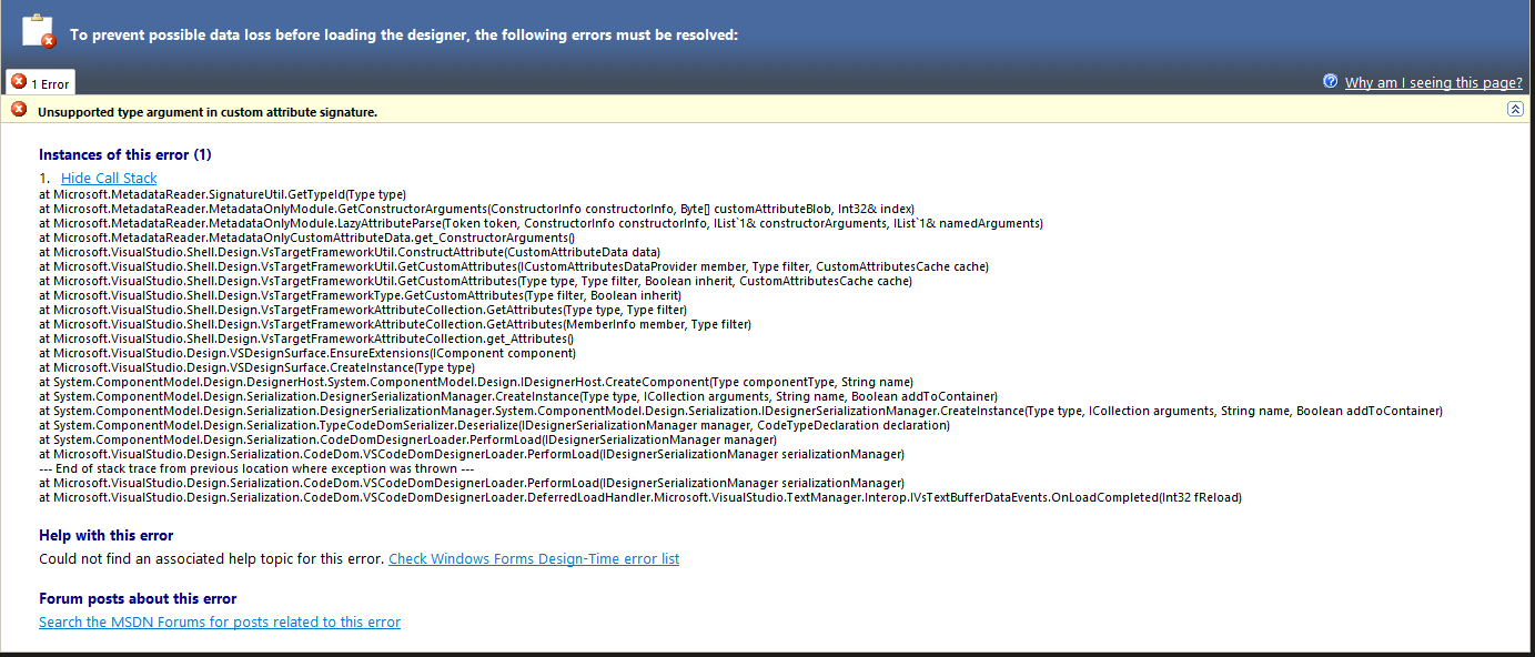 I am migrating reports from .Net Framework 4.5.2 to .Net Core 3.1. I've been having issues with the report designer within Visual Studio as it seems not to work. I've been trying for a while, with different libraries/dlls but no success. The reports do work on Core, the only problem seems to be the VS Designer. We really don't wanna switch to some other designer to edit out existing reports so if possible we'd like to use it the same way that we've been using it till now. The image with the error is attached. How would we go about fixing this? Is it even possible? Thank you for answer in advance!