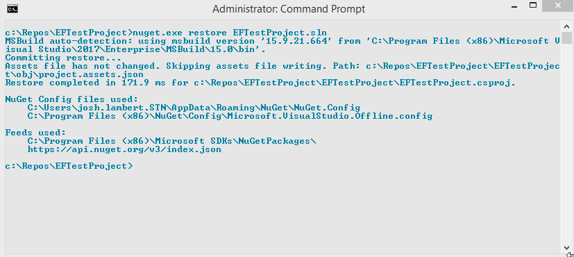 I was able to finally get the restore done (I think) and attached the screenshot of the output, but I am still getting the same error. I am using the latest version of VS 2017 (15.9.6).