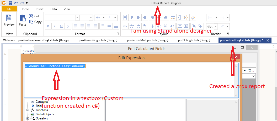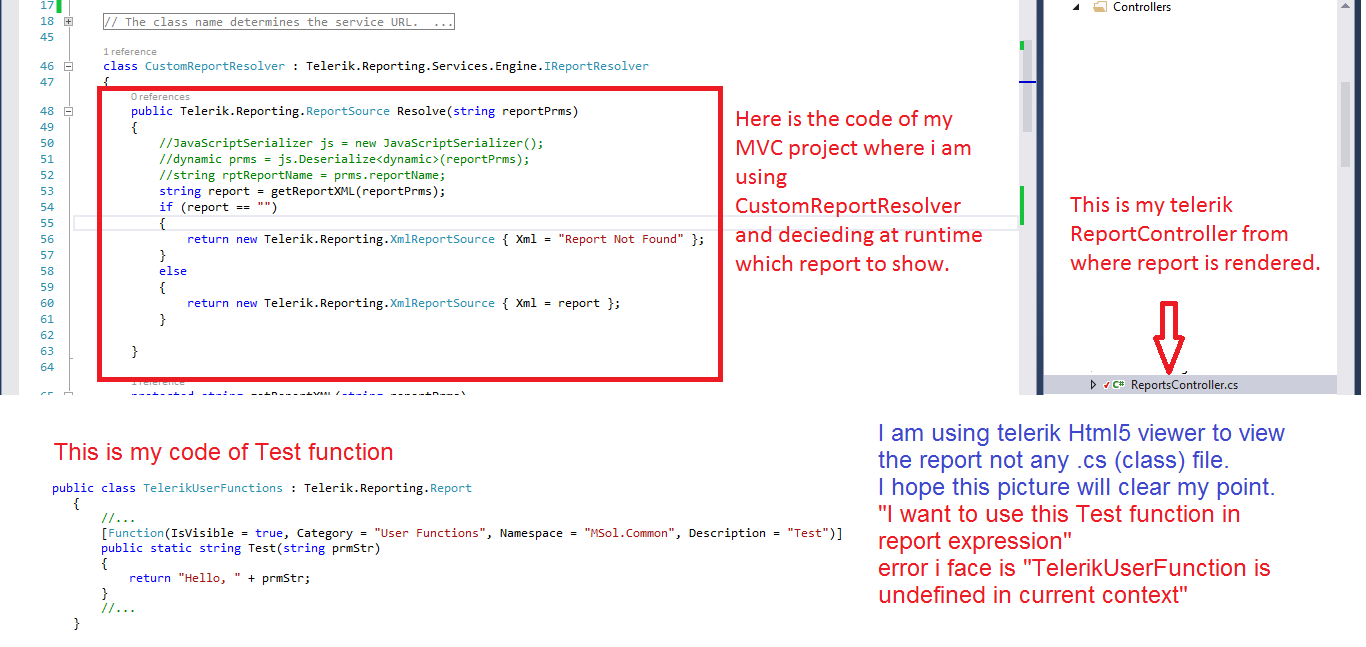 namespace MySol{ public class TelerikUserFunctions : Telerik.Reporting.Report { //... [Function(IsVisible = true, Category = "User Functions", Namespace = "MySol", Description = "Test")] public static string Test(string prmStr) { return "Hello, " + prmStr; } //... }}Please review expression contains undefined function call MyUserFunction() error KB article for possible reasons for the issue.