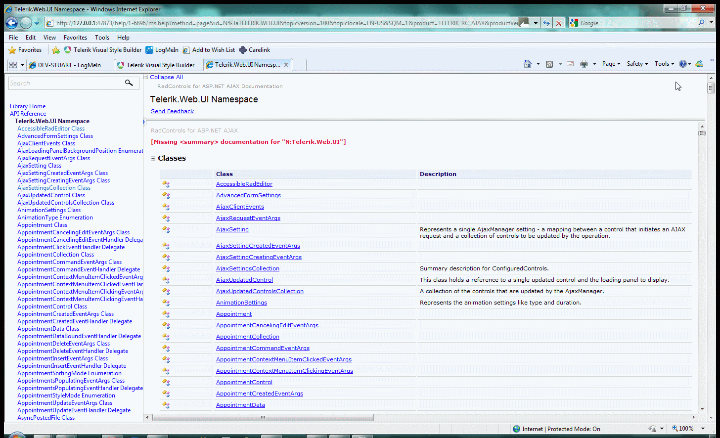 When I click on the link to open the docs in a browser and navigate to the API Reference | Telerik.Web.UI Namespace the top of the page indicates a missing reference...