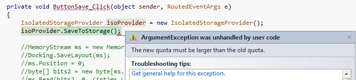 After a few saves, I'l get an error "New quota must be larger than the old quota exception" (see attached image). Once this happens I cannot save to Isolated Storage again. I'm wondering if this is a problem on Telerik's side or am I supposed to catch this error and do something.