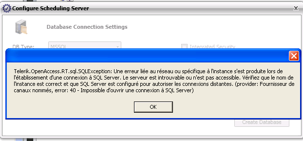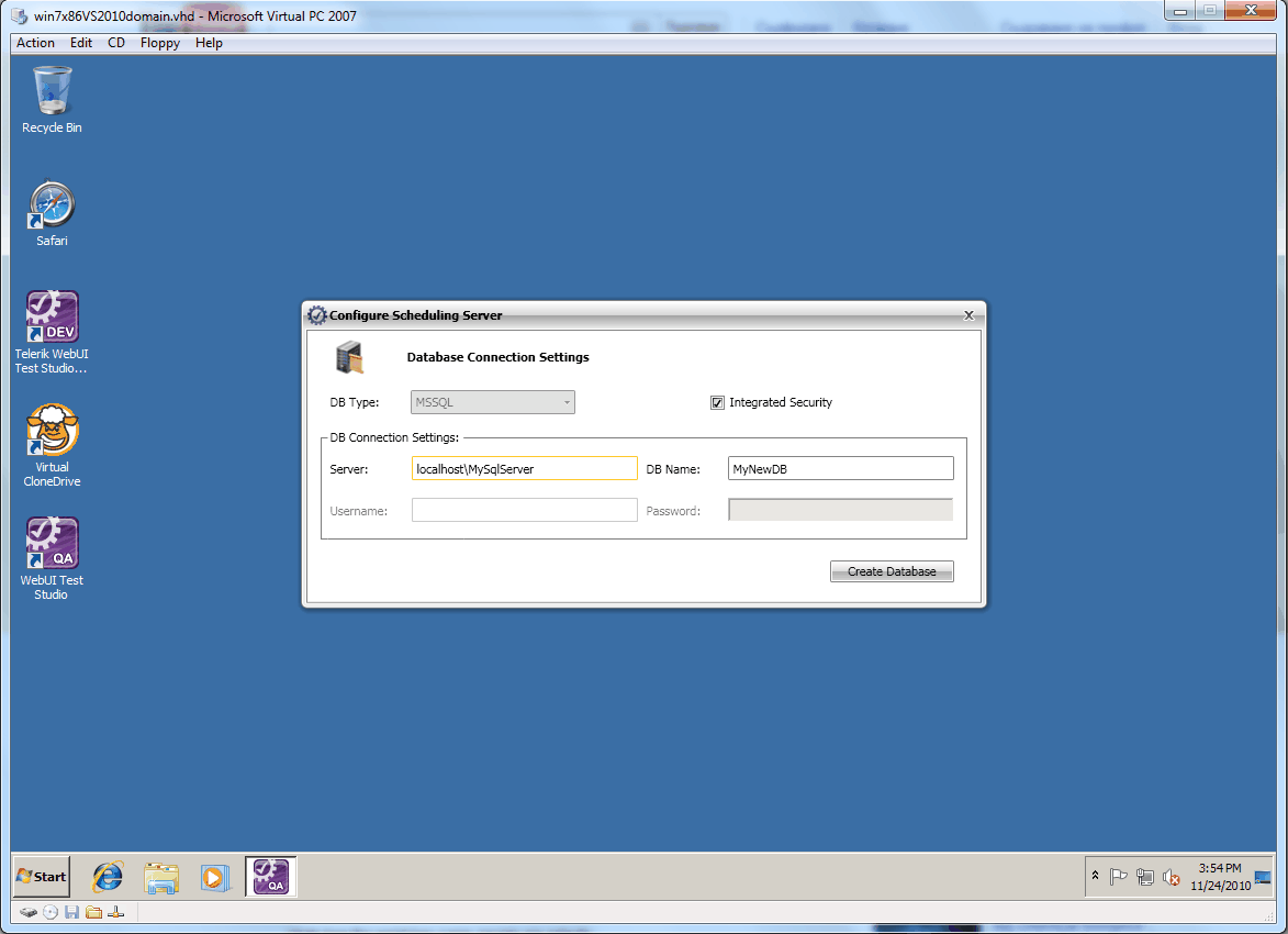 There's a checkbox called Integrated Security. You can check this if and only if your Master (Scheduling Server) and your SQL Server are located on the same machine. I'll assume there are so go ahead and check it. You no longer have to write a user/pass because now we're using the user you're logged on with. Just a note: if you uncheck Integrated Security, you have to create a user for yourself from the SQL Server Management Studio which you may or may not have installed. But there's really no reason to uncheck if you're Scheduling and SQL Server will be on the same machine.