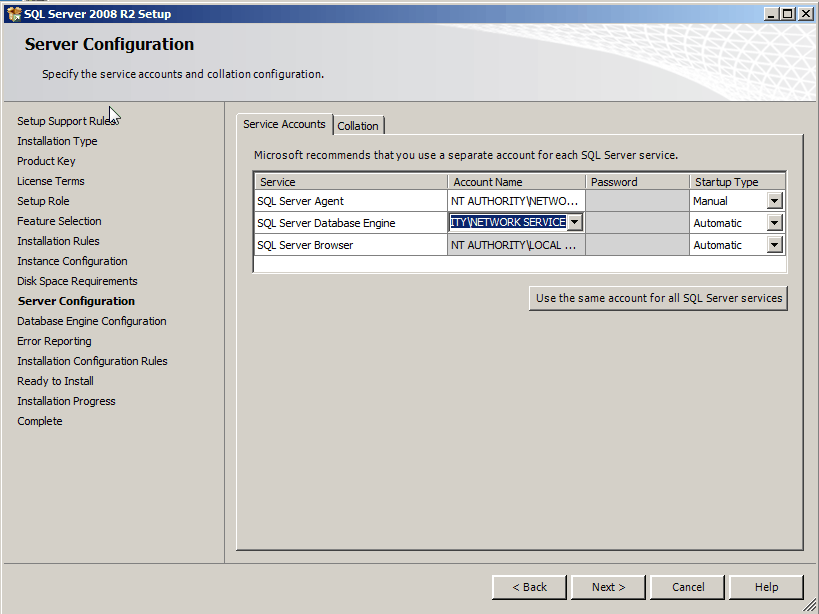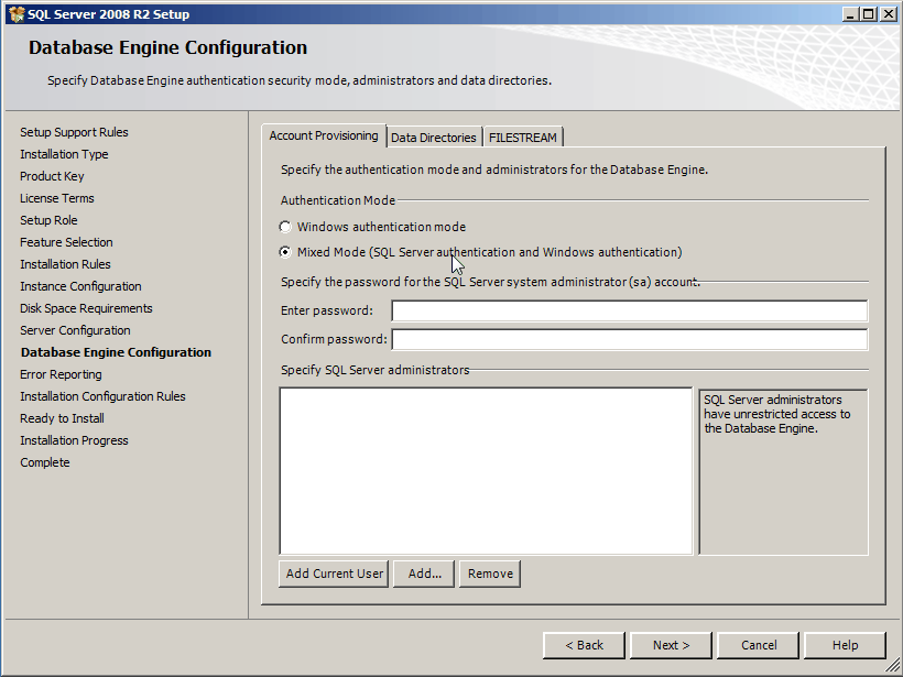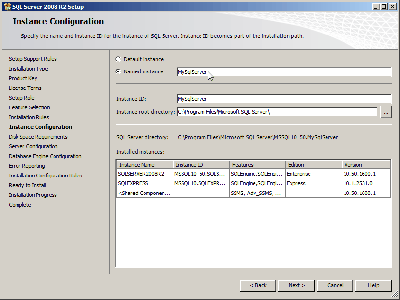 I'm going to go ahead and assume that you've decided to use the same machine for your Master and your SQL Server. Installing a SQL Server has one or two tricky moments but it's easy overall. At some point during the installation you were asked to name your instance in a screen like the one in screenshot 2. As you can see I've chosen MySqlServer as the name for instance of the server. You can choose any name you like but don't forget it because you'll need give it to Configure Scheduling Server tool later. The two other touchy parts of the installation are shown in screenshots 3 and 4. You have to choose Mixed Authentication Mode. The other thing is making sure all your services are shared in the network (as opposed to just local). The rest of the installation is mostly clicking "Next".