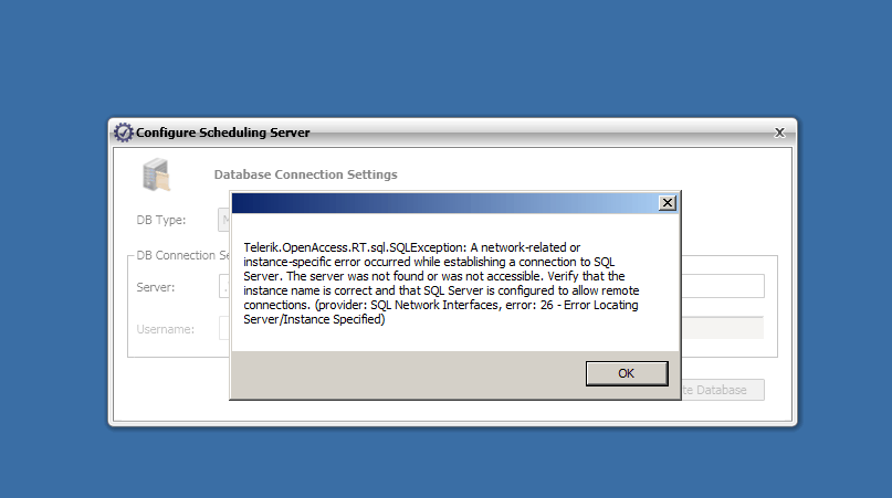 Now let's talk about the Configure Scheduling Server tool. This is the tool which you're trying to use in the screenshot. This tool establishes the connection between the SQL Server and your Master (connection 1 in the diagram above). The SQL Server and the Master can be on different machines but I highly recommend that you use the same machine for both - it will be easier to configure.