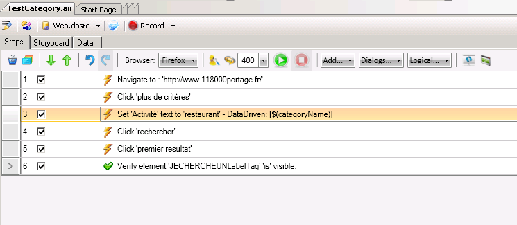I will explain my test: it is a test web which contains 6 steps that verifie the existance of elements on web pages, doing research on this search engine for 2000 categories that I retrieved from a db using databinding.