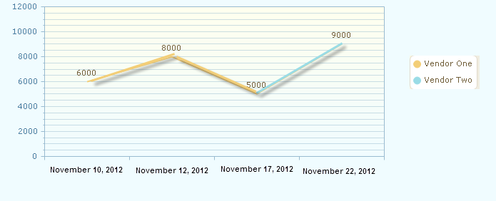 <telerik:RadChart runat="server" ID="RadChart2" Skin="LightBrown"> <Series> <telerik:ChartSeries Name="Vendor One" Type="Line"> <Items> <telerik:ChartSeriesItem YValue="6000" XValue="41245.211"> </telerik:ChartSeriesItem> <telerik:ChartSeriesItem YValue="8000" XValue="41251.44"> </telerik:ChartSeriesItem> </Items> </telerik:ChartSeries> <telerik:ChartSeries Name="Vendor Two" Type="Line"> <Items> <telerik:ChartSeriesItem YValue="5000" XValue="41253.345"> </telerik:ChartSeriesItem> <telerik:ChartSeriesItem YValue="9000" XValue="41254.72315"> </telerik:ChartSeriesItem> </Items> </telerik:ChartSeries> </Series> <PlotArea> <XAxis > <Appearance> <LabelAppearance RotationAngle="70"></LabelAppearance> </Appearance> </XAxis> <YAxis AxisMode="Extended"> </YAxis> </PlotArea> <ChartTitle> <TextBlock Text="Chart Problem"> </TextBlock> </ChartTitle> </telerik:RadChart>