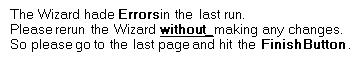 <html><span style="font-size: 10pt">The Wizard hade <strong>Errors</strong> in the last run. <br />Please rerun the Wizard <strong><u>without</u></strong> making any changes. <br />So please go to the last page and hit the<strong> Finish Button</strong>.</span></html>
