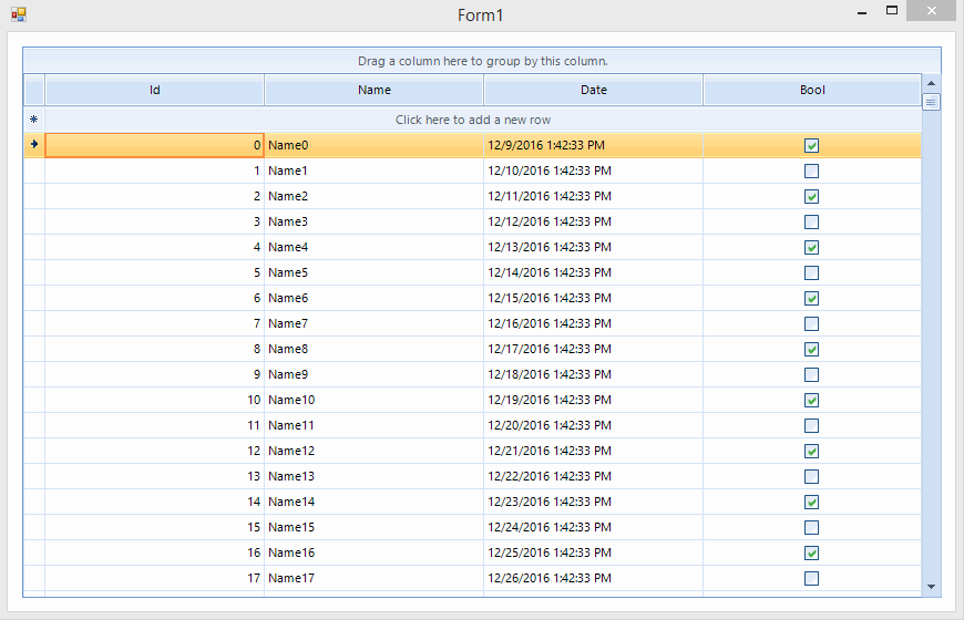 public partial class Form1 : Form{ public Form1() { InitializeComponent(); DataTable dt = new DataTable(); dt.Columns.Add("Id", typeof(int)); dt.Columns.Add("Name", typeof(string)); dt.Columns.Add("Date", typeof(DateTime)); dt.Columns.Add("Bool", typeof(bool)); for (int i = 0; i < 500; i++) { dt.Rows.Add(i, "Name" + i, DateTime.Now.AddDays(i), i % 2 == 0); } this.radGridView1.DataSource = dt; this.radGridView1.AutoSizeColumnsMode = Telerik.WinControls.UI.GridViewAutoSizeColumnsMode.Fill; this.radGridView1.MouseDown += radGridView1_MouseDown; } private void radGridView1_MouseDown(object sender, MouseEventArgs e) { if (this.radGridView1.IsInEditMode) { return; } RadGridView grid = (RadGridView)sender; RadElement element = grid.ElementTree.GetElementAtPoint(e.Location); if (element is RadCheckmark) { return; } GridDataCellElement dataCell = element as GridDataCellElement; if (dataCell == null) { RadElement parent = element.Parent; while (parent != null) { if (parent is GridDataCellElement) { dataCell = (GridDataCellElement)parent; break; } parent = parent.Parent; } } if (dataCell != null) { dataCell.RowElement.RowInfo.Cells["Bool"].Value = !(bool)dataCell.RowElement.RowInfo.Cells["Bool"].Value; } }}I am also sending you a short video showing the result on my end.