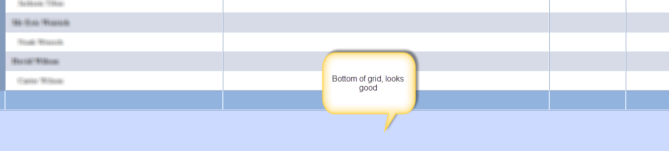 If i set both properties ie: NoDetailRecordsText="No details" NoMasterRecordsText="No master" and using NeedDataSource for my binding and GroupExpressions. This is the oddity, the "NoMasterRecords" and "NoDetailRecordsText" DO NOT show when i have data, which is good. I can not see it at the bottom of the data. However, if i use the collapse arrow on the Group, it appears at the bottom of the collapsed Group. Once I open it back up, it is there now at the bottom. This is all Client side, no postbacks. The NoRecordsTemplate works the same way. I see if AFTER i open back up the collapse. No scrolls, i have this at 100% height