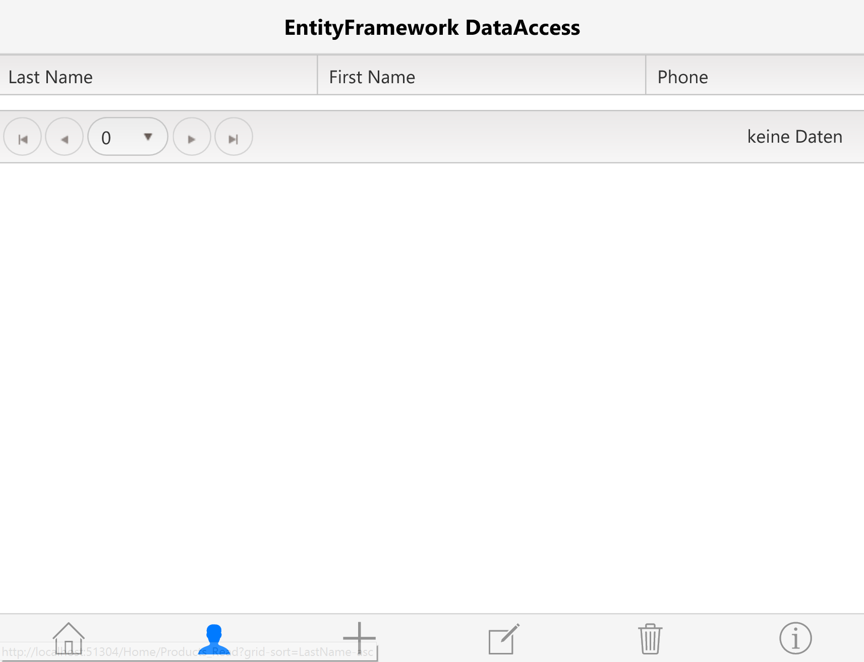 01.@(Html.Kendo().MobileView()02. .Title("EntityFramework DataAccess")03. .Name("Index")04. .Content(@<text>05. <div id="AddressList">06. @(Html.Kendo().Grid<vEF_Library.Address>()07. .Name("AddressGrid")08. .Columns(columns =>09. {10. columns.Bound(c => c.LastName);11. columns.Bound(c => c.FirstName);12. columns.Bound(c => c.Phone);13. })14. .HtmlAttributes(new { style = "height: 100%;" })15. .HtmlAttributes(new { style = "width: 100%;" })16. .Scrollable()17. //.Groupable()18. .Sortable()19. .Pageable(pageable => pageable20. .Refresh(true)21. .PageSizes(true)22. .ButtonCount(10))23. .DataSource(dataSource => dataSource24. .Ajax()25. .Read(read => read.Action("Index", "Addresses"))26. )27. )28. </div>29. </text>)30.)What is wrong?