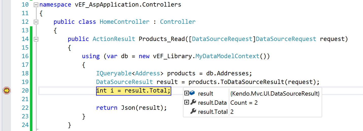 01.namespace vEF_AspApplication.Controllers02.{03. public class AddressesController : Controller04. {05. private MyDataModelContext db = new MyDataModelContext();06. 07. // GET: Addresses08. public async Task<ActionResult> Index()09. {10. var addresses = db.Addresses.Include(a => a.FormOfAddress).Include(a => a.Title);11. return View(await addresses.ToListAsync());12. }13. }14.}Viewcode: