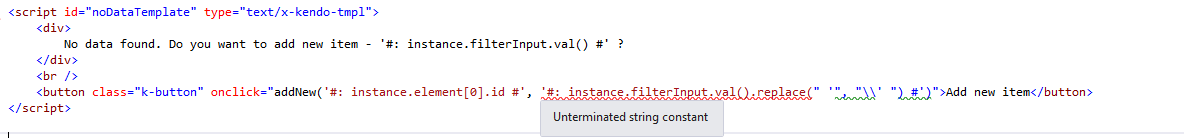 I have implemented the kendo UI drop down list in jQuery making use of the no data template too add a new item when the search returns no results. My no data template is defined as follows: