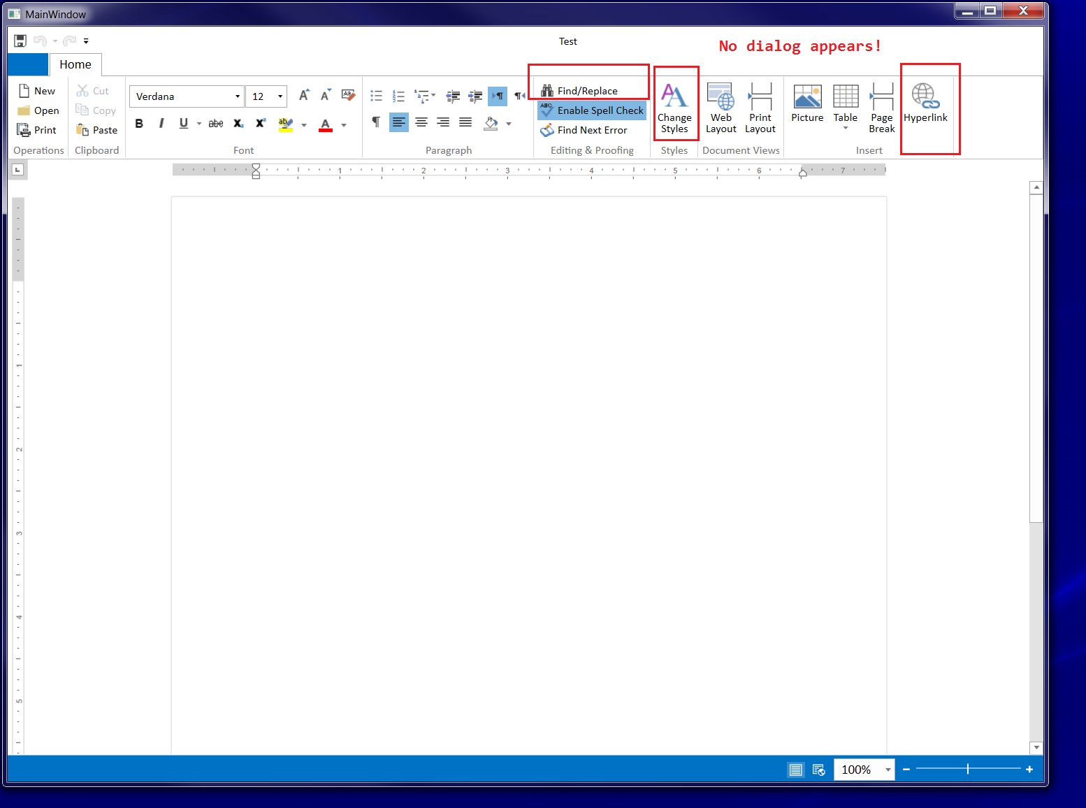 I'm unable to get the dialogs to show up while using implicit theming with Office2013. Please see the attached image and zip file with the sample solution.