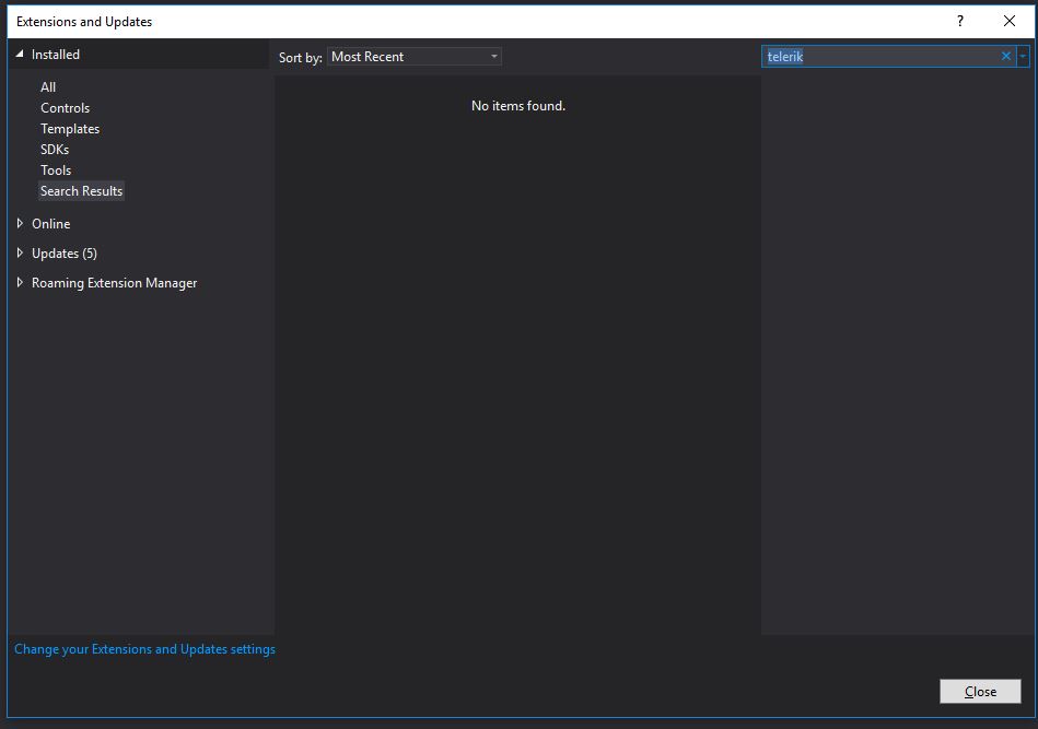 In case you have already tried the above steps, please check the Extensions folder and its subfolders (located in %LocalAppData%\Microsoft\VisualStudio\[VSversion]\Extensions) for the Telerik extensions. You can share screenshots of those folders for a better overview.