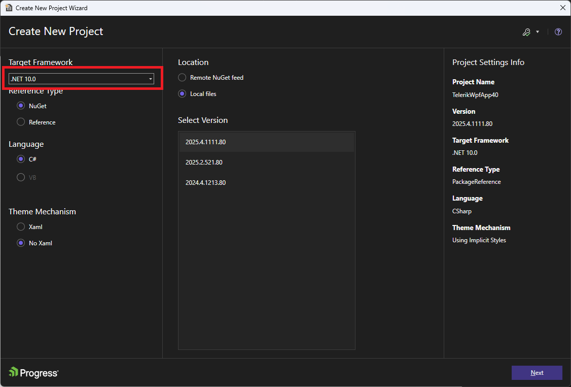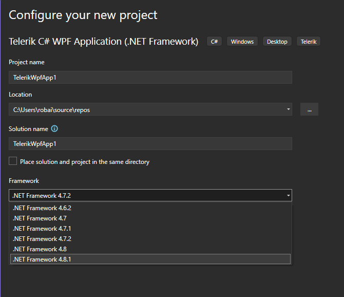 So how do we select .NET 10 framework for a Telerik WPF project?