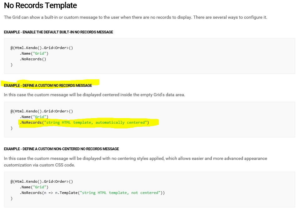 // string .NoRecords(norecs=>norecs.Template("You search returned no results"))// template id.NoRecords(norecs=>norecs.TemplateId("no-records-template"))<script id="no-records-template" type="text/x-kendo-template"> <strong> No records match your search.</strong></script>Kind Regards,