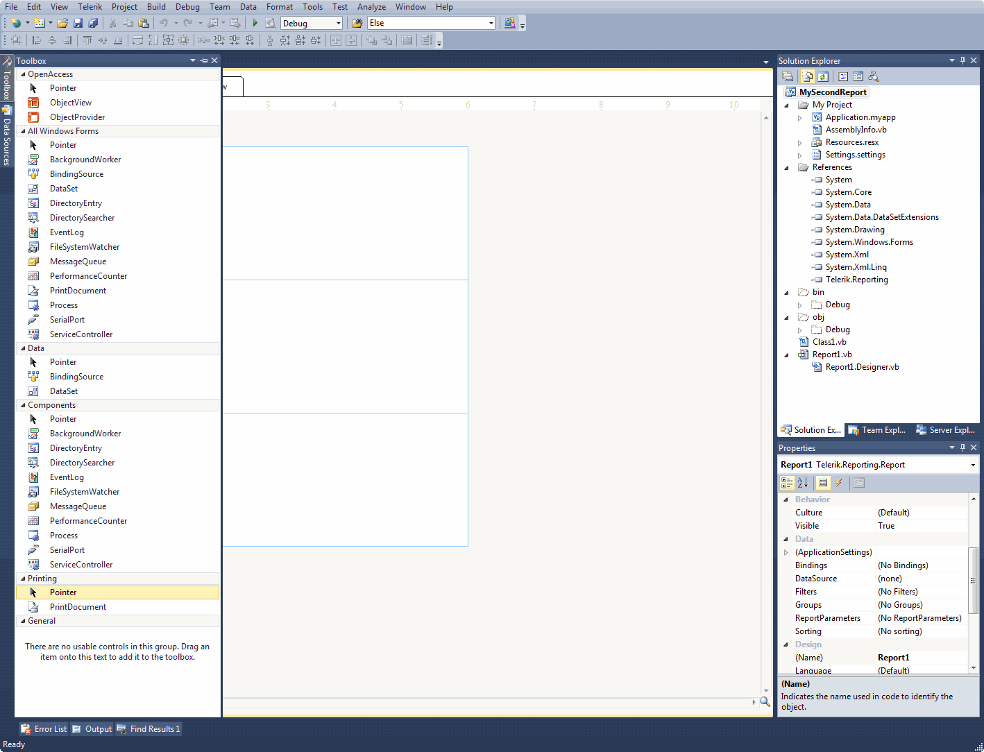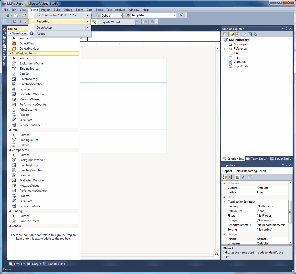 But I am having a problem with Reporting. I do not have any Telerik Reporting tab or controls in the Visual Studio toolbox. I have attached a screen capture graphic of the problem.