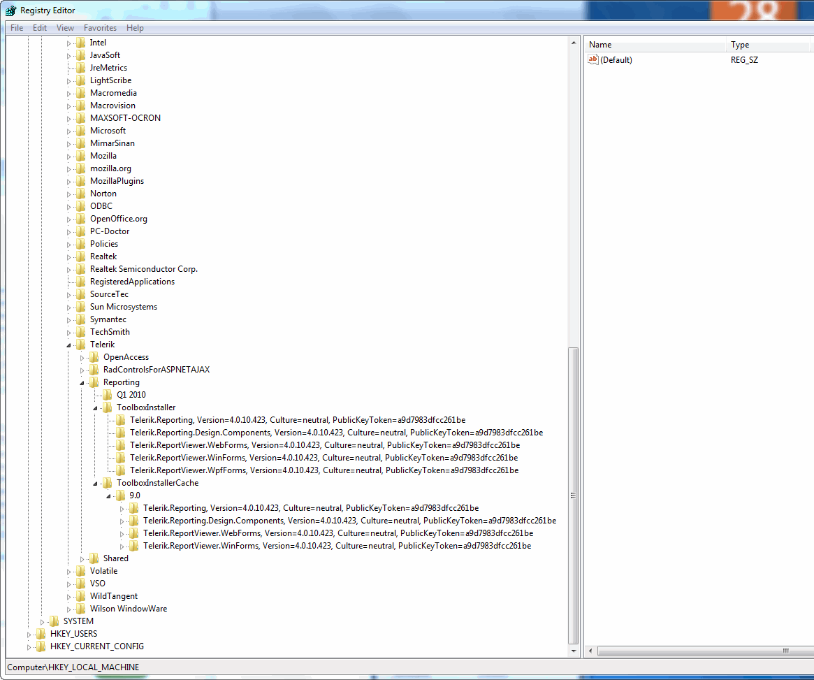Below is how the Telerik Reporting registry should look like when installed correctly:
