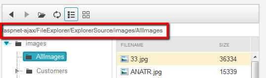 <telerik:RadFileExplorer runat="server" ID="FileExplorer1" Width="520px" Height="350px" InitialPath="/aspnet-ajax/FileExplorer/ExplorerSource/images/AllImages" > <Configuration ViewPaths="~/aspnet-ajax/FileExplorer/ExplorerSource/images"></Configuration></telerik:RadFileExplorer>Regards,