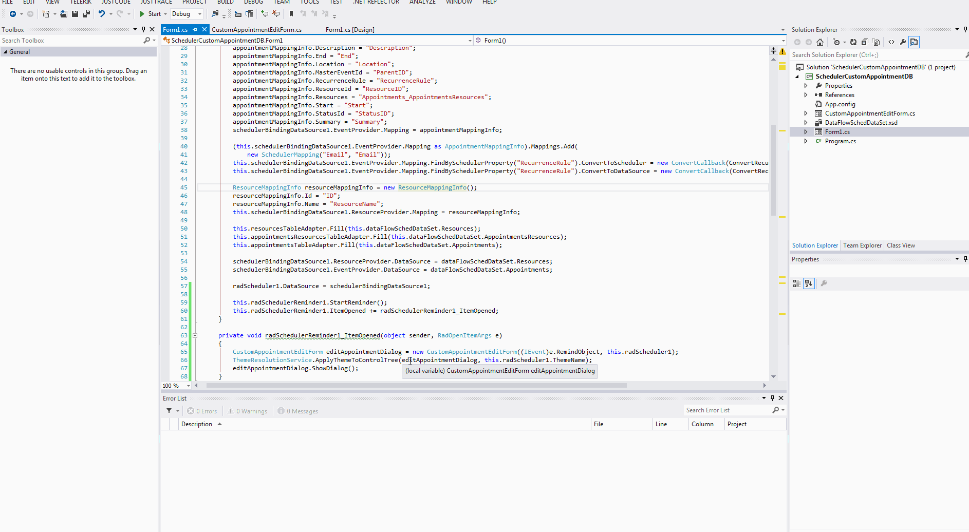 In my solution, i added a scheduler, with no binding datasource. I am loading data to the scheduler from a database table named "Remndr_table".